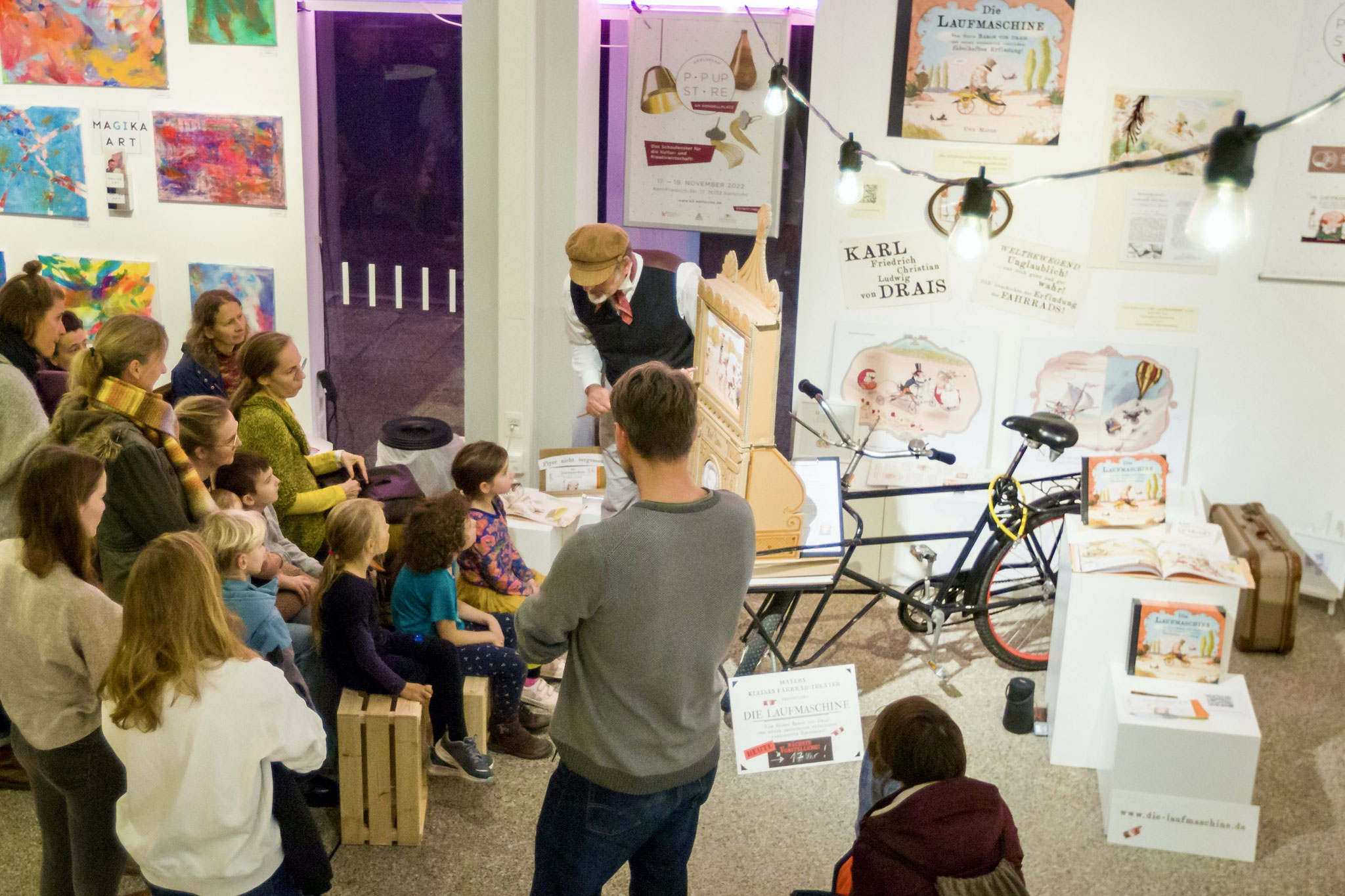 Ein Kinderworkshop von und mit Uwe Mayer, einschl. einer Lesung „DIE LAUFMASCHINE“ und einem persönlichen Überraschungsbesuch des guten, alten Zweirad-Erfinders Karl Drais (als Stabpuppe).