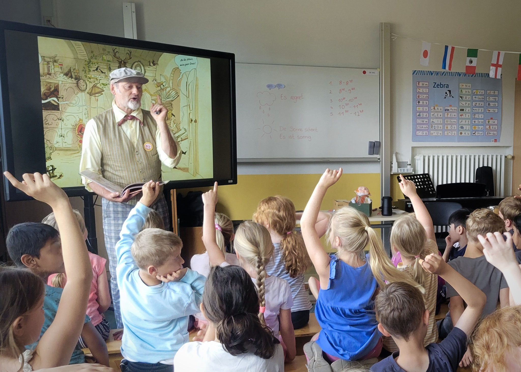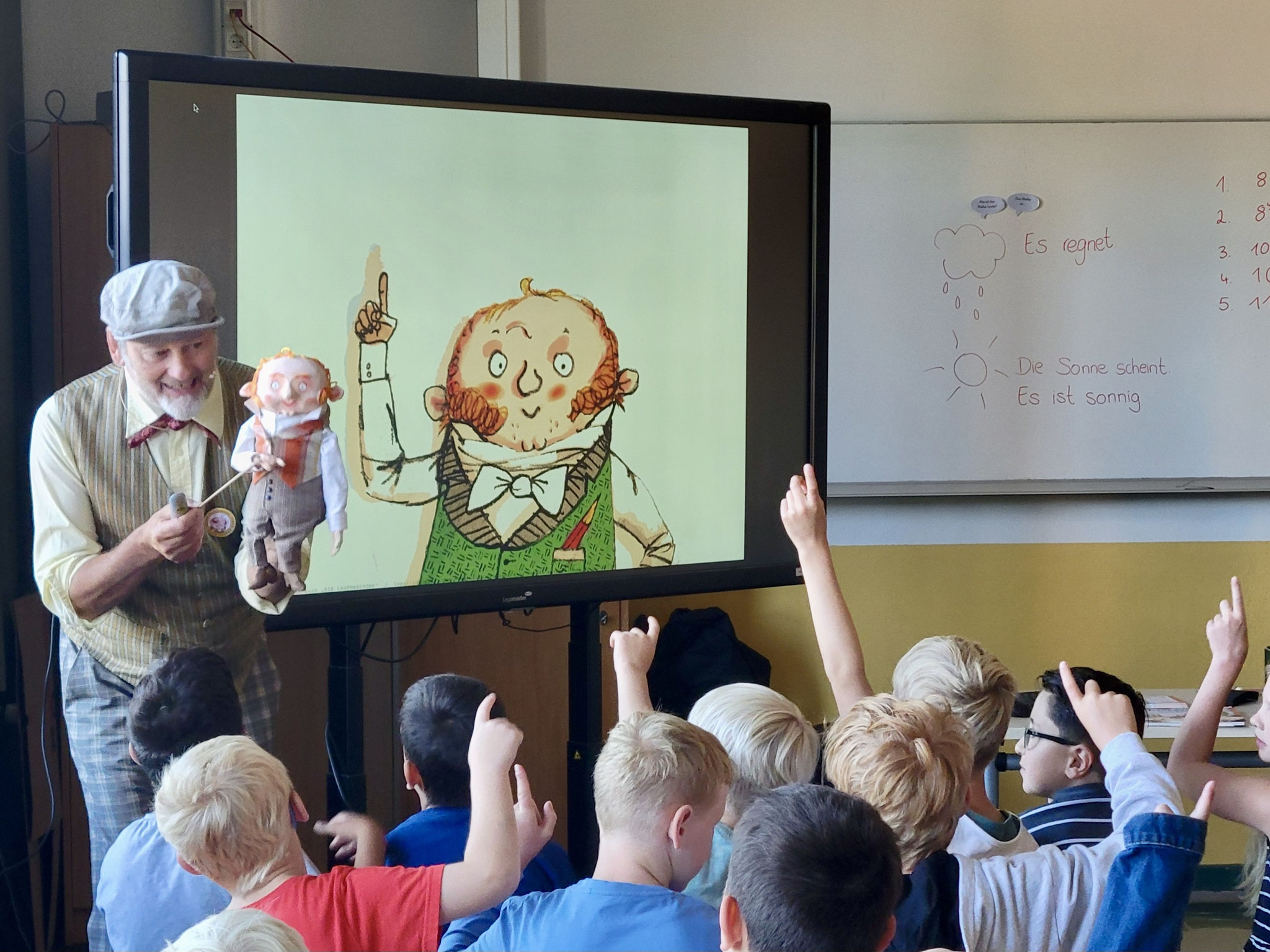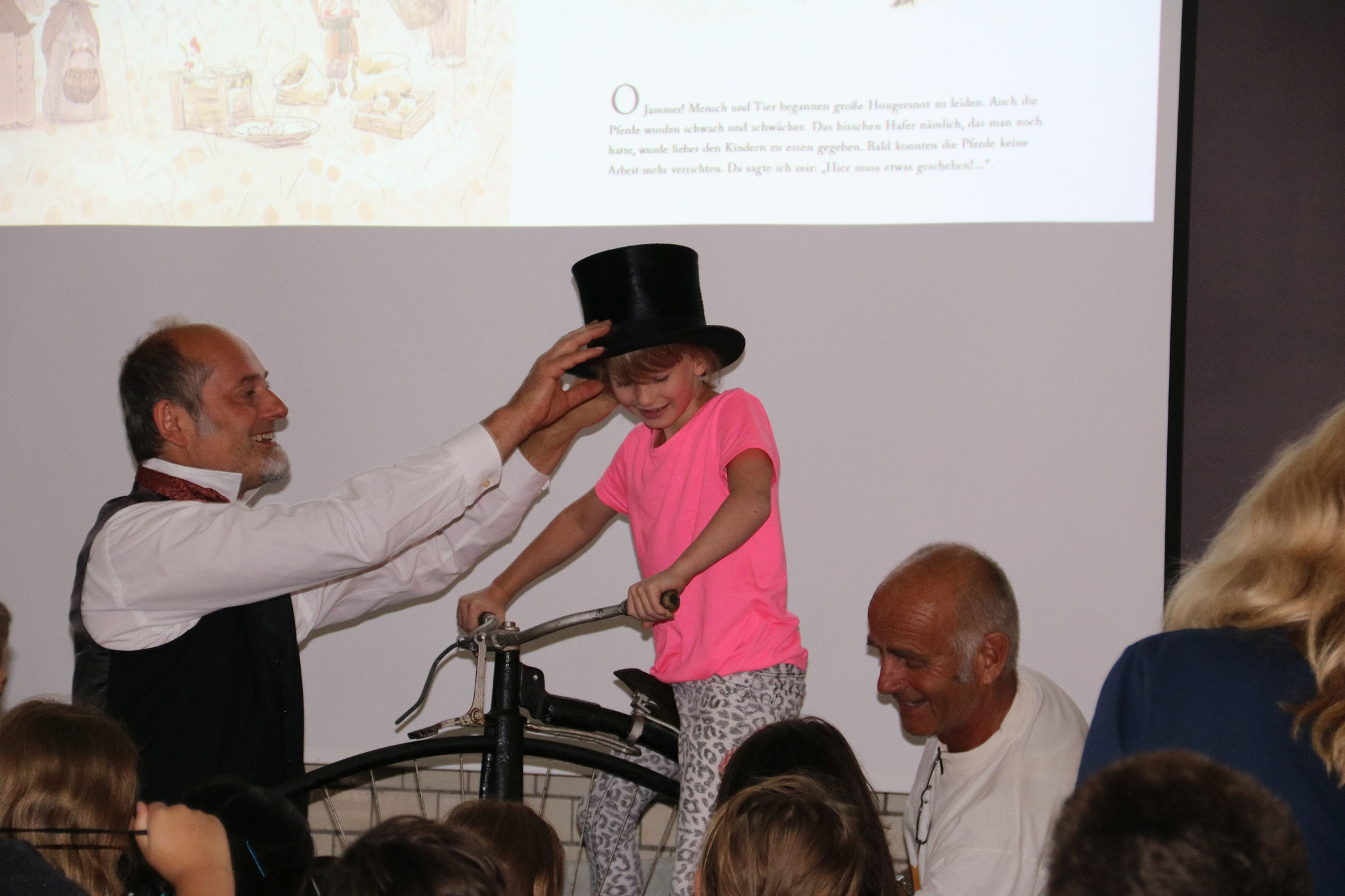Preisverleihung an die Schule für das gute Resultat beim Stadtradeln mit dem kleinen Herrn Drais (Stabpuppe)! Danach 4 Lesungen „Die Laufmaschine", für die ganze Schule.